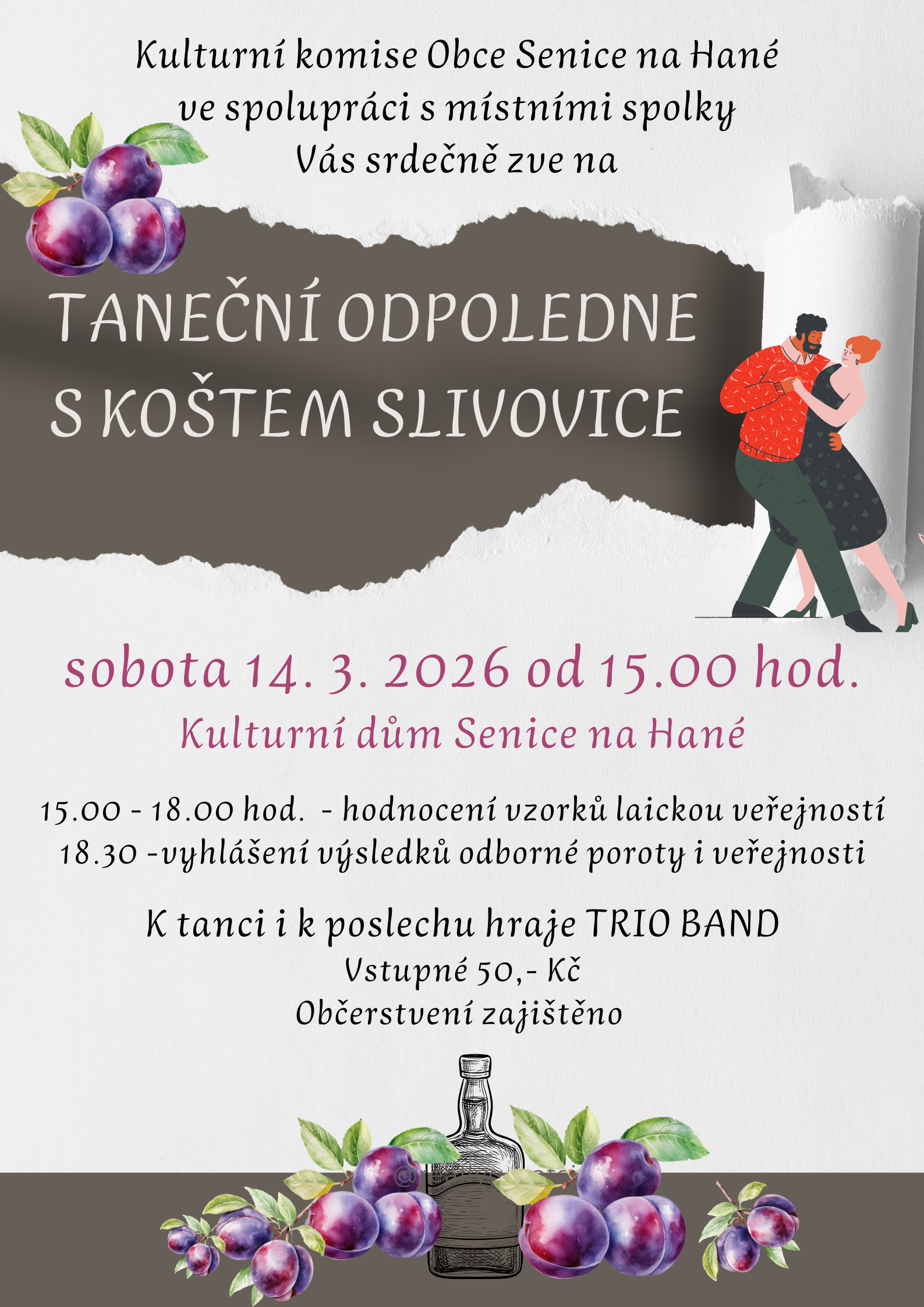 Kulturní komise obce Senice na Hané ve spolupráci s místními spolky srdečně zve v sobotu 14. března do kulturního domu na TANEČNÍ ODPOLEDNE S KOŠTEM SLIVOVICE. Do letošního ročníku bylo přihlášeno 33 vzorků, přijďte ochutnat, jak pálí sousedé, a vybrat vítěze letošního koštu. Soutěž začíná v 15.00 hod., vyhlášení výsledků proběhne v 18.30 hod. Odpoledne si mohou užít ovšem i tanečníci a vinaři, které slivovice nezajímá. Občerstvení bude připraveno pro všechny a k tanci i k poslechu hraje kapela TRIO BAND. Pro seniory z Cakova i Odrlic je připraven tradiční odvoz obecním autem. V případě zájmu o odvoz se nahlaste na telefonním čísle 774 480 526 u p. Pruckové. Těšíme se na Vaši účast.