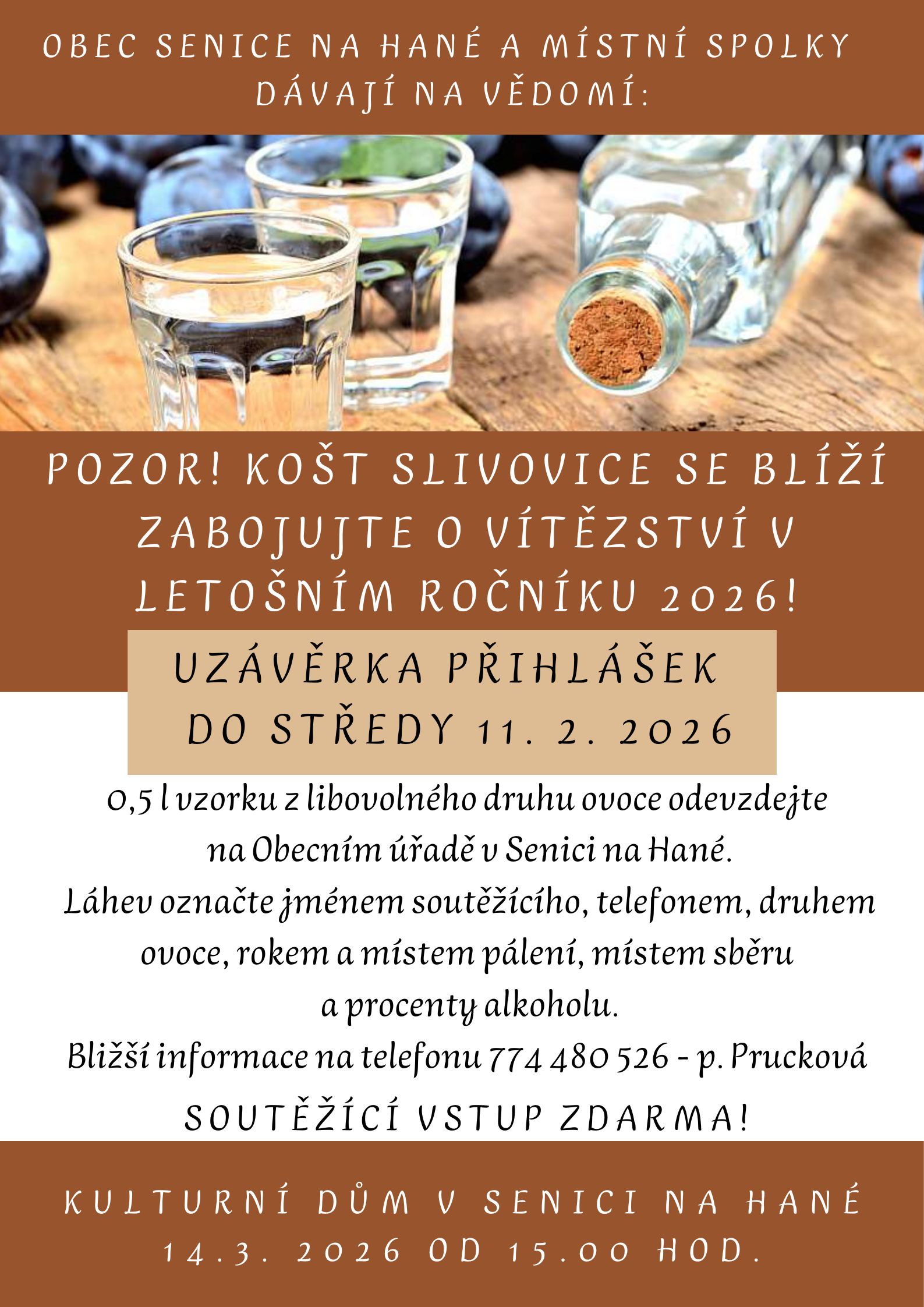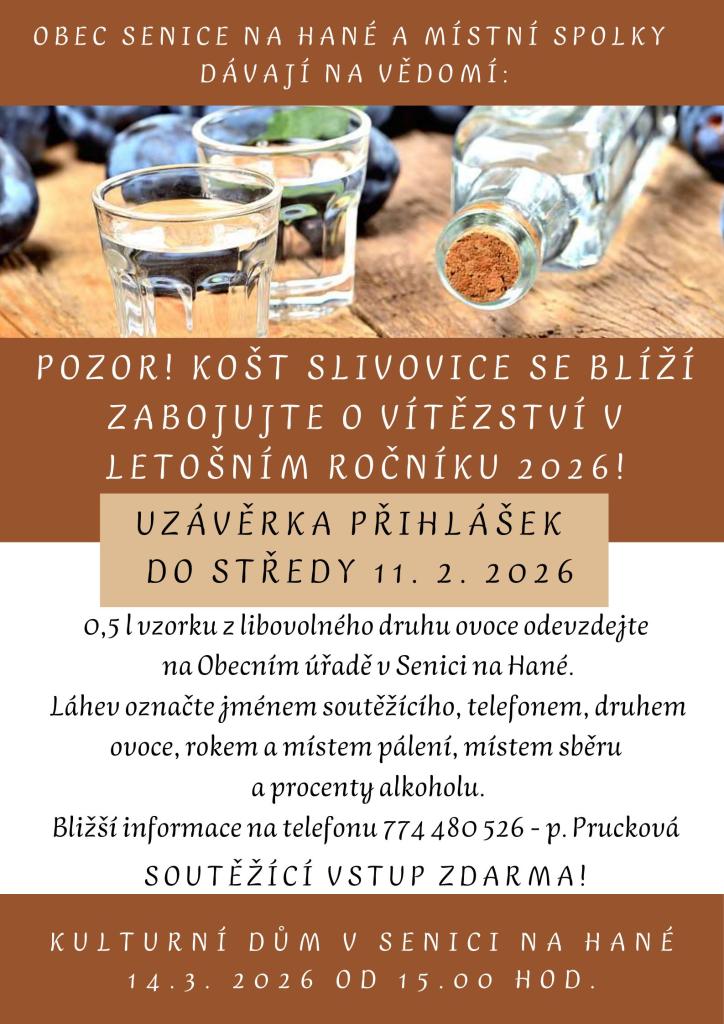 Kulturní komise obce žádá zájemce, kteří chtějí zabojovat o vítězství v letošním Koštu slivovice, aby odevzdávali své vzorky na Obecním úřadě v Senici na Hané. Půl litru soutěžního vzorku označte svým jménem, telefonním číslem, druhem páleného ovoce, rokem a místem vypálení, dále místem sběru a procenty alkoholu. Vzorky budou přijímány od středy 28. 1. do středy 11. února 2026. Bližší informace Vám poskytnou pracovnice obecního úřadu nebo paní Prucková na tel. 774 480 526.
